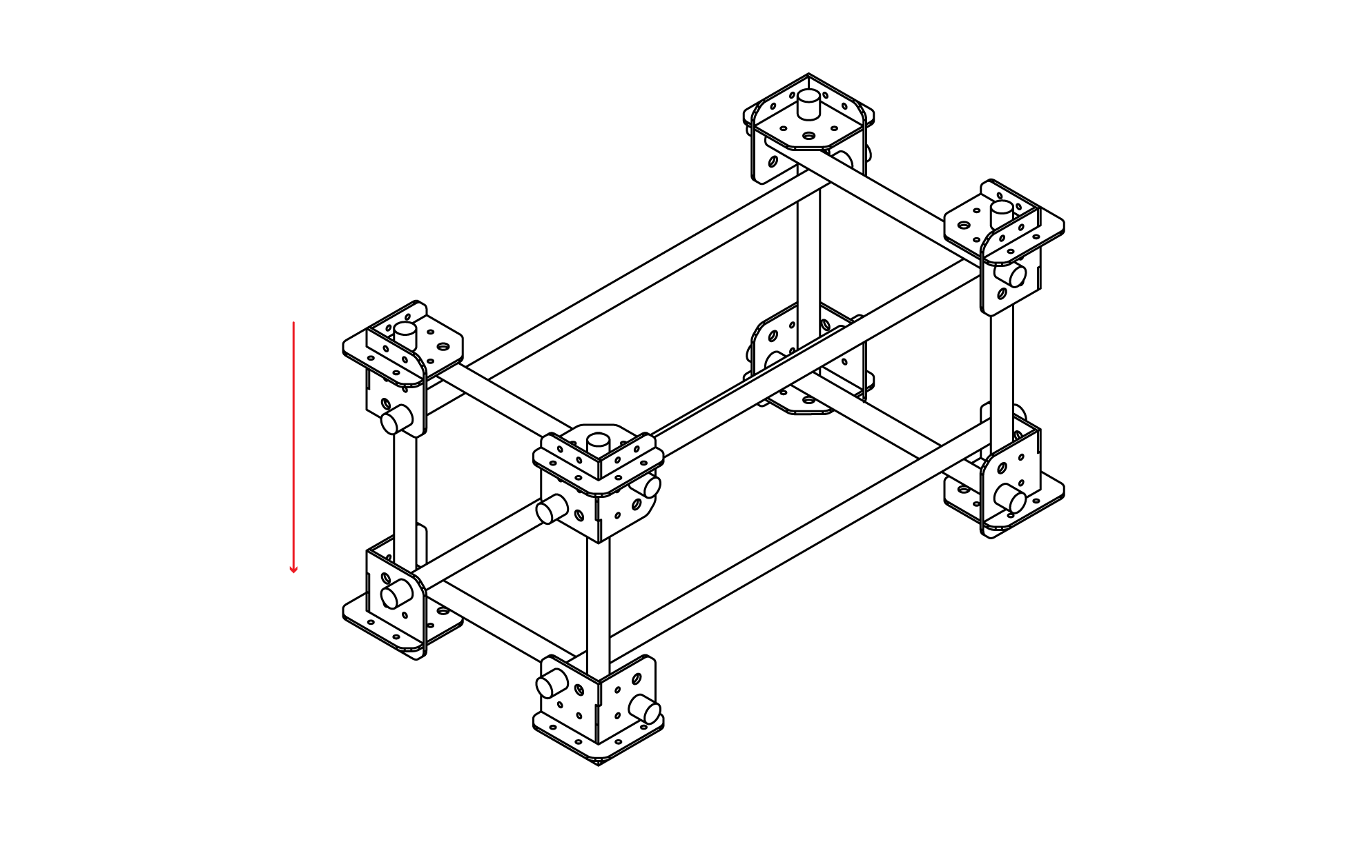 1. Ensure all the holes are precisely aligned, as the system depends on their positional accuracy. One piece is constructed first; the second is it's mirrored counterpart, achieved through interchange of identical elements. Repeat this to make the vertices.